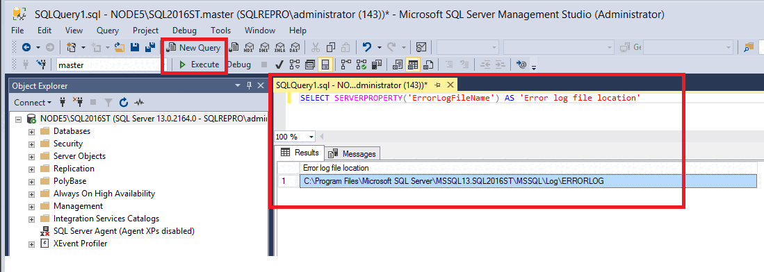 SELECT SERVERPROPERTY('ErrorLogFileName') AS 'Error log file location';The results show the location of the error log in the file system:
