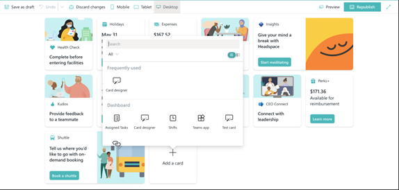 | Dashboard | The dashboard is your user's digital toolset that brings together the resources your users need whether they are in the office or in the field. The dashboard uses dynamic cards that users can interact with to do things like clock in for a shift, access training materials, review paystub information, or book a shuttle. It can also be used as a web part on SharePoint home sites. Cards in the Connections dashboard are based on adaptive cards and the SharePoint Framework (SPFx). They provide a low-code solution to bring your line-of-business apps into the dashboard. In addition, Connections desktop combined with SharePoint home sites can also be further customized and extended using SPFx web parts and extensions. |
