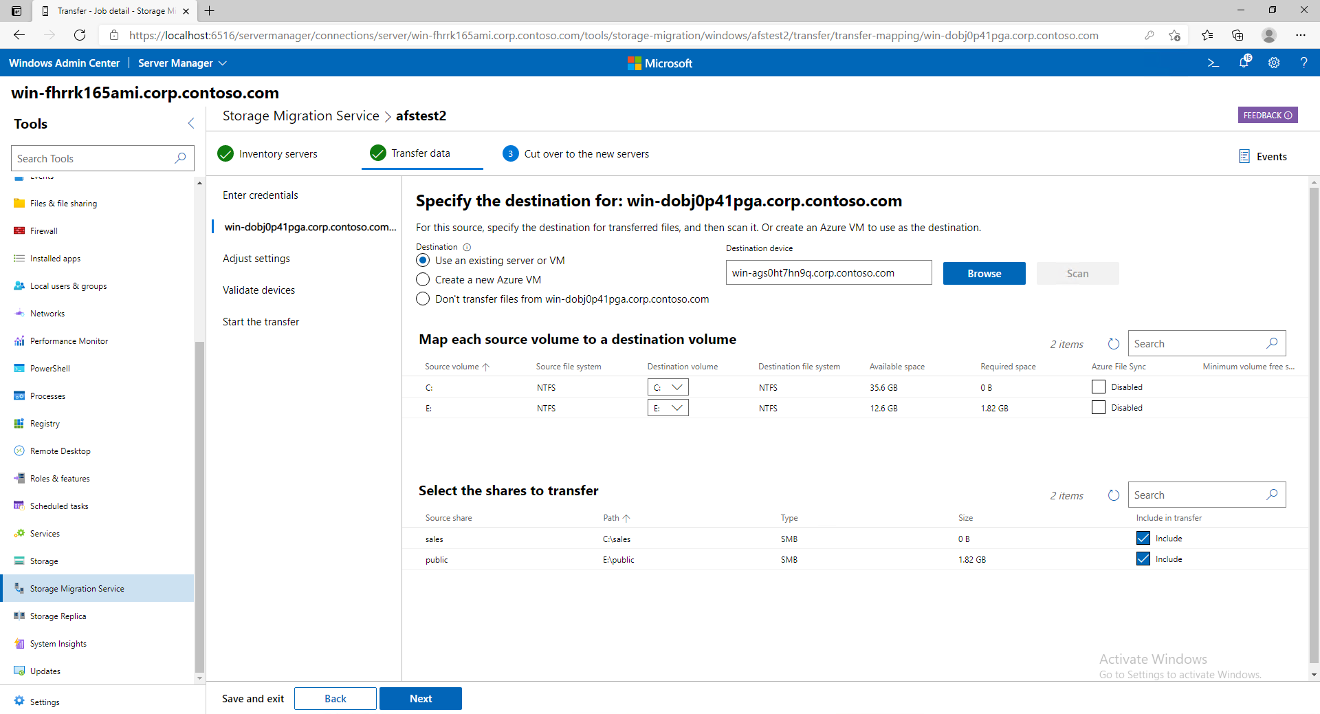 The first time you transfer, we move any existing files in a destination to a backup folder. For destination servers running Azure File Sync with cloud tiering, this backup option isn't supported. We otherwise fully support Azure File Sync with cloud tiering and include updated transfer information details in WAC. On subsequent transfers, by default we refresh the destination without backing it up first. Storage Migration Service is smart enough to deal with overlapping shares—we don't copy the same folders twice in the same job.