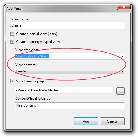 After you click the Add button, \Movies\Create.aspx View template will be created for you. Because we selected "Create" from the "view content" dropdown, the Add View dialog automatically "scaffolded" some default content for us. The scaffolding created an HTML <form>, a place for validation error messages to go, and since scaffolding knows about Movies, it created Label and Fields for each property of our class.