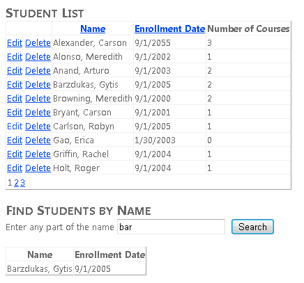 In the SearchGridView control replace the markup for the Name and Enrollment Date columns as you did in the StudentsGridView control, except omit the EditItemTemplate element. The Columns element of the SearchGridView control now contains the following markup: