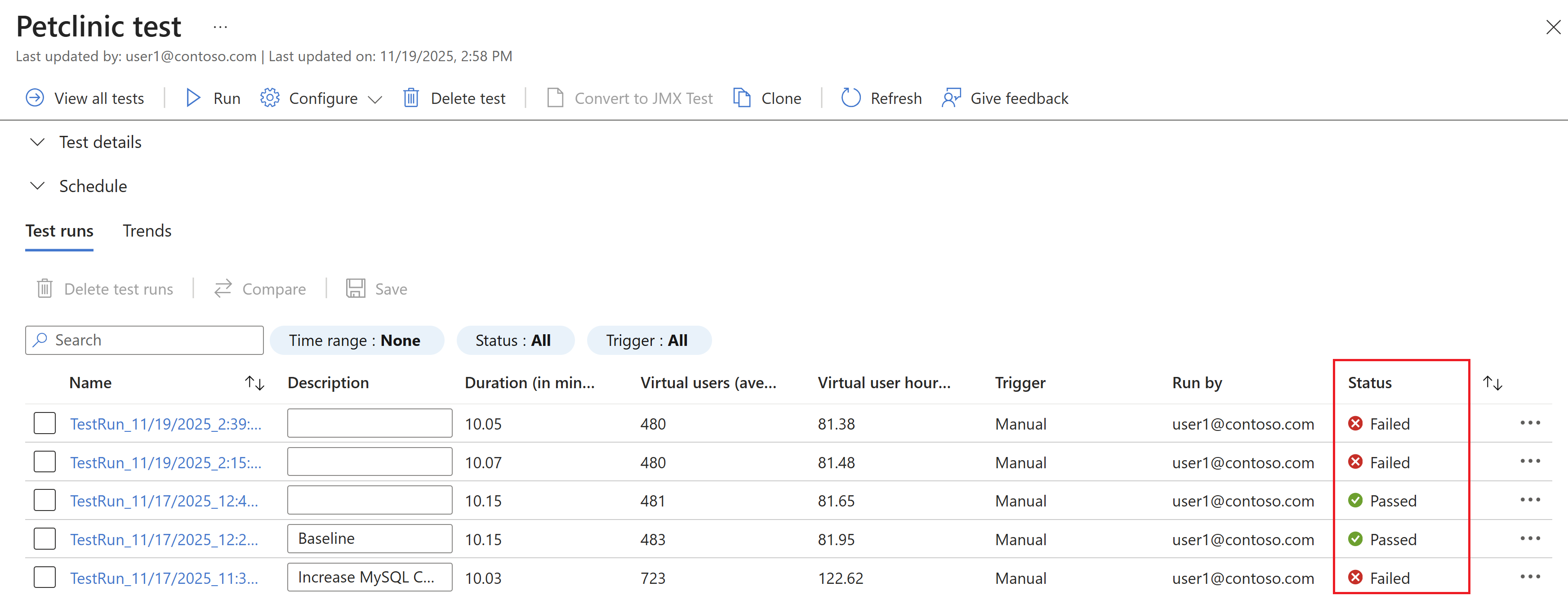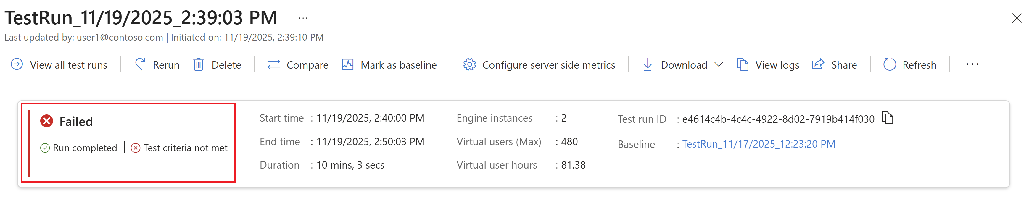 A load test might run the test script until the end, but might not pass all the test fail criteria. If at least one of the test criteria didn't pass, the status of the test run is set to Failed.