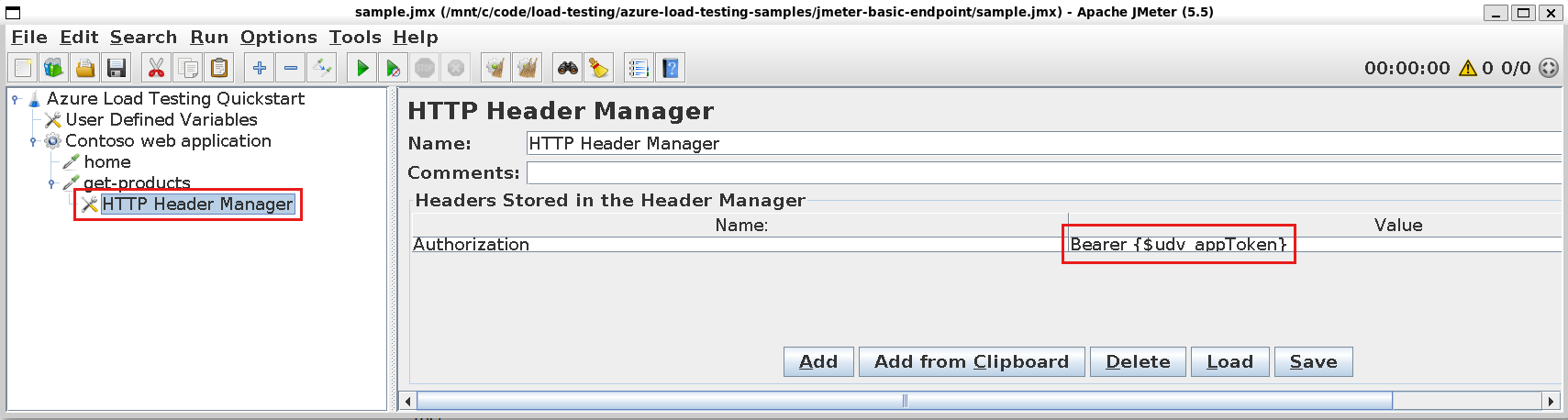 GetSecretfunction abstracts retrieving the value from either Azure Key Vault or the CI/CD secrets store.Update the JMeter sampler component to pass the secret in the request.