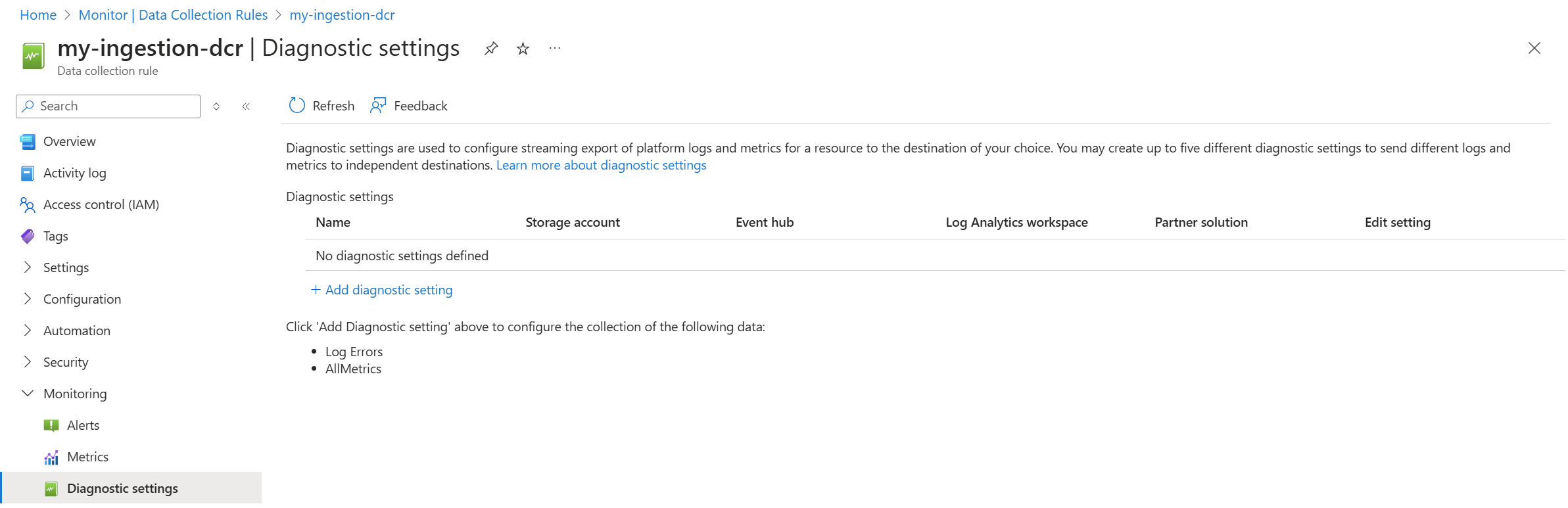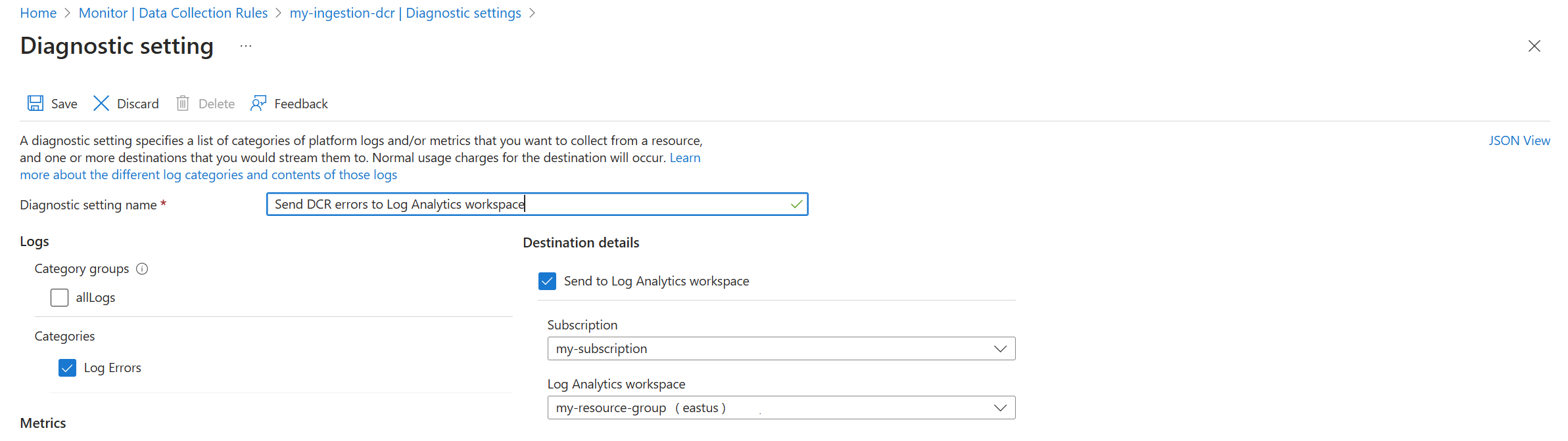 DCR error logs are implemented as resource logs in Azure Monitor. Enable log collection by creating a diagnostic setting for the DCR. Each DCR will require its own diagnostic setting. See Create a diagnostic setting for the detailed process. Select the category Log Errors and Send to Log Analytics workspace. You may want to select the same workspace that's used by the DCR, or you may want to consolidate all of your error logs in a single workspace.