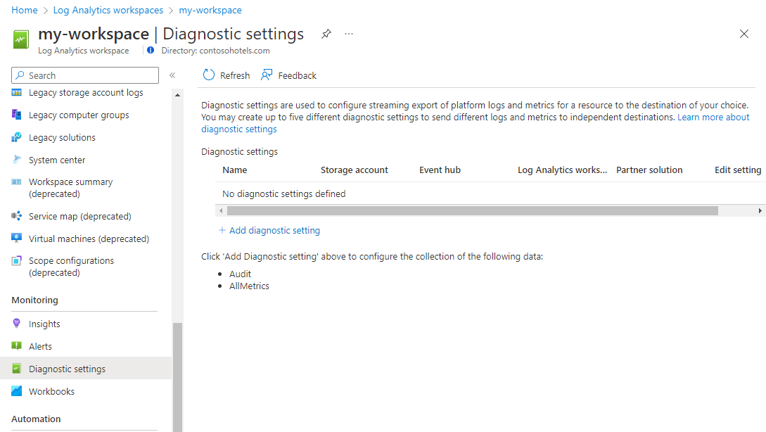 • From the Azure Monitor menu, select Diagnostic settings, and then locate and select the workspace.