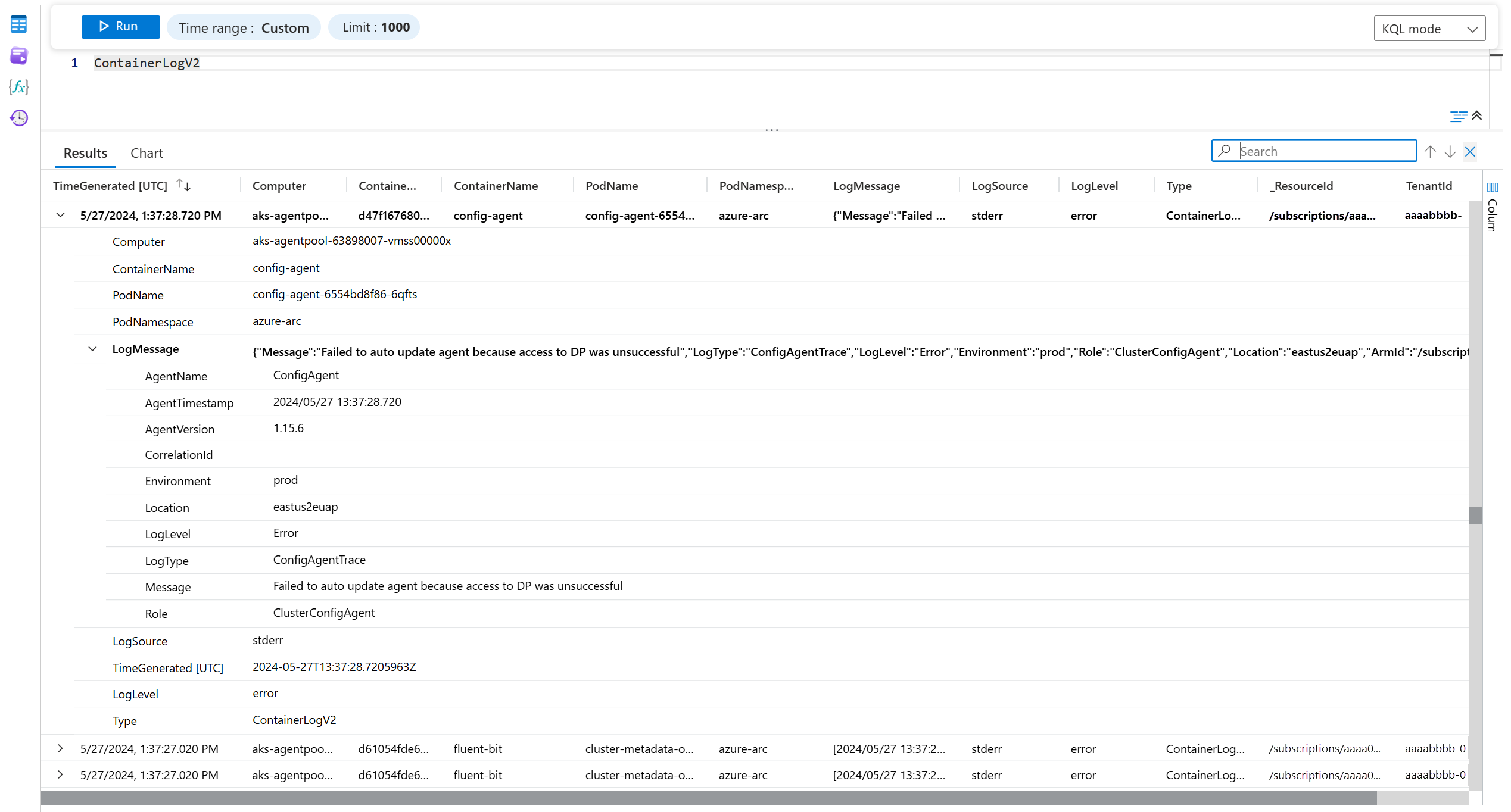 ContainerLogV2 | summarize Count = count() by Computer, ContainerName, PodName, PodNamespace, LogSource, LogLevel, Message = tostring(LogMessage.Message)