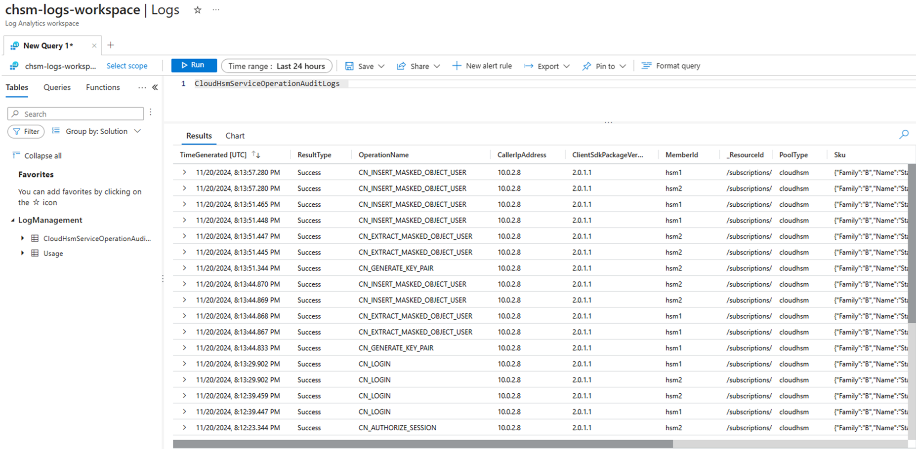 You can also query Cloud HSM operation event logs by using the Azure CLI and Azure PowerShell. In this example, you update ResourceGroupName and WorkspaceName:
