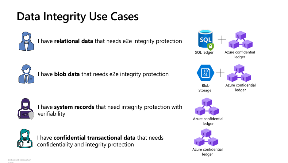 - I have blob data that needs end to end integrity: Store your data in Azure Blob Storage and configure the Azure Marketplace application backed by confidential ledger to store signatures and verify against.