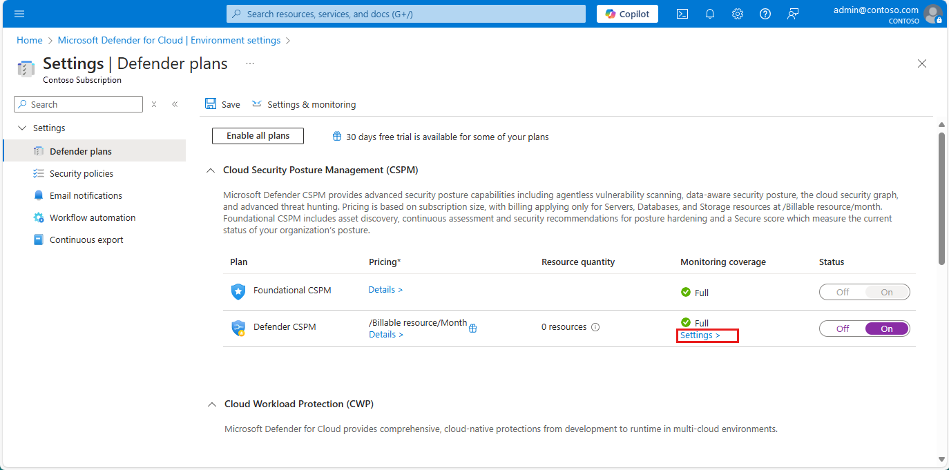 On the Defender plans page, toggle the Defender CSPM plan to On.