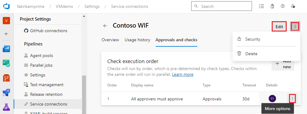 To edit existing approvals and checks, select from the More options menu next to the approval on the Approvals and checks tab.