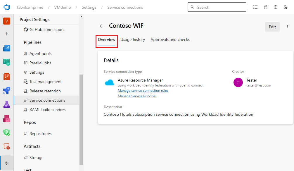 The Overview tab shows the details of the service connection, such as connection type, creator, and authentication type.