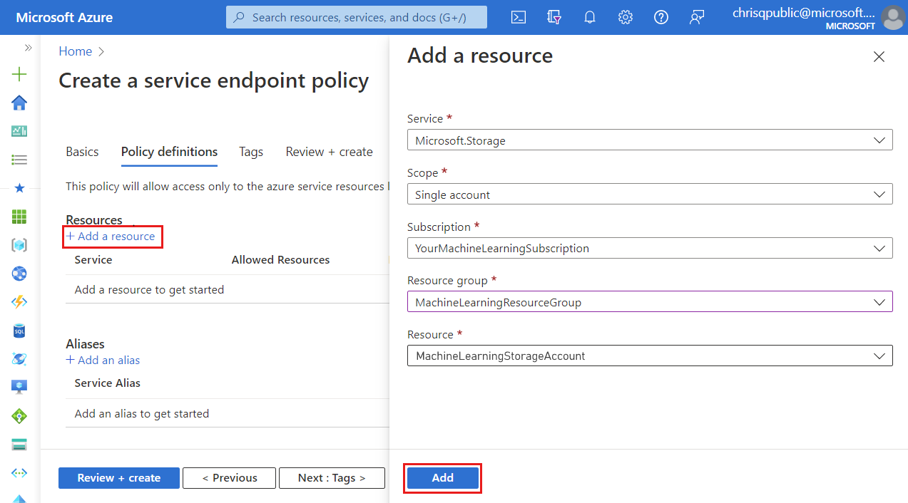 /services/Azure/MachineLearningas the Server Alias value. Select Add to add the alias.Note