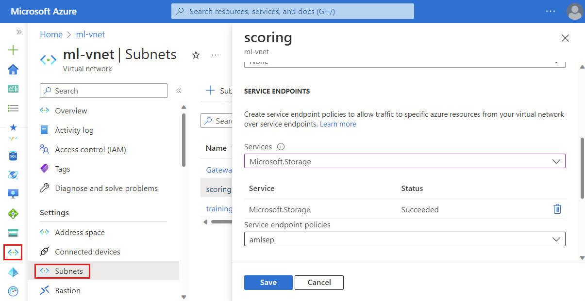 Use the following steps to enable a storage endpoint for the subnet that contains your Azure Machine Learning compute clusters and compute instances: