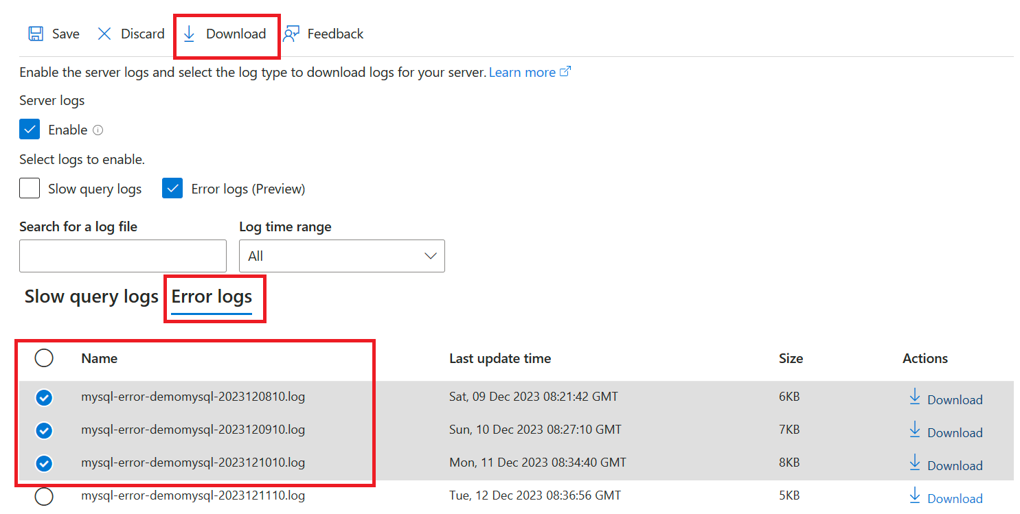 To download multiple log files at one time, under Name, select the files you want to download, select Download.