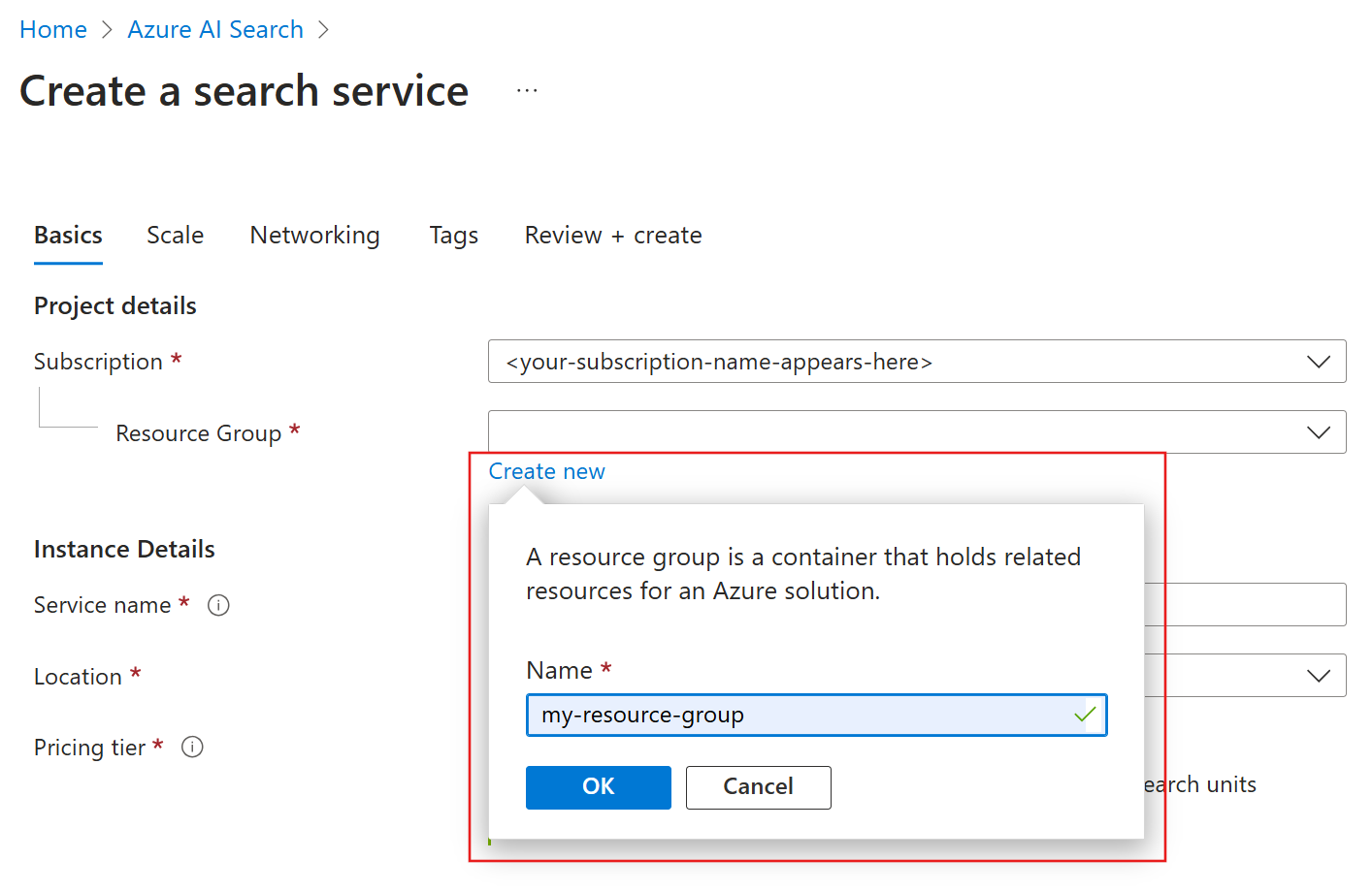 Screenshot of the Create a Resource Group dialog on the Create a Search Service page.