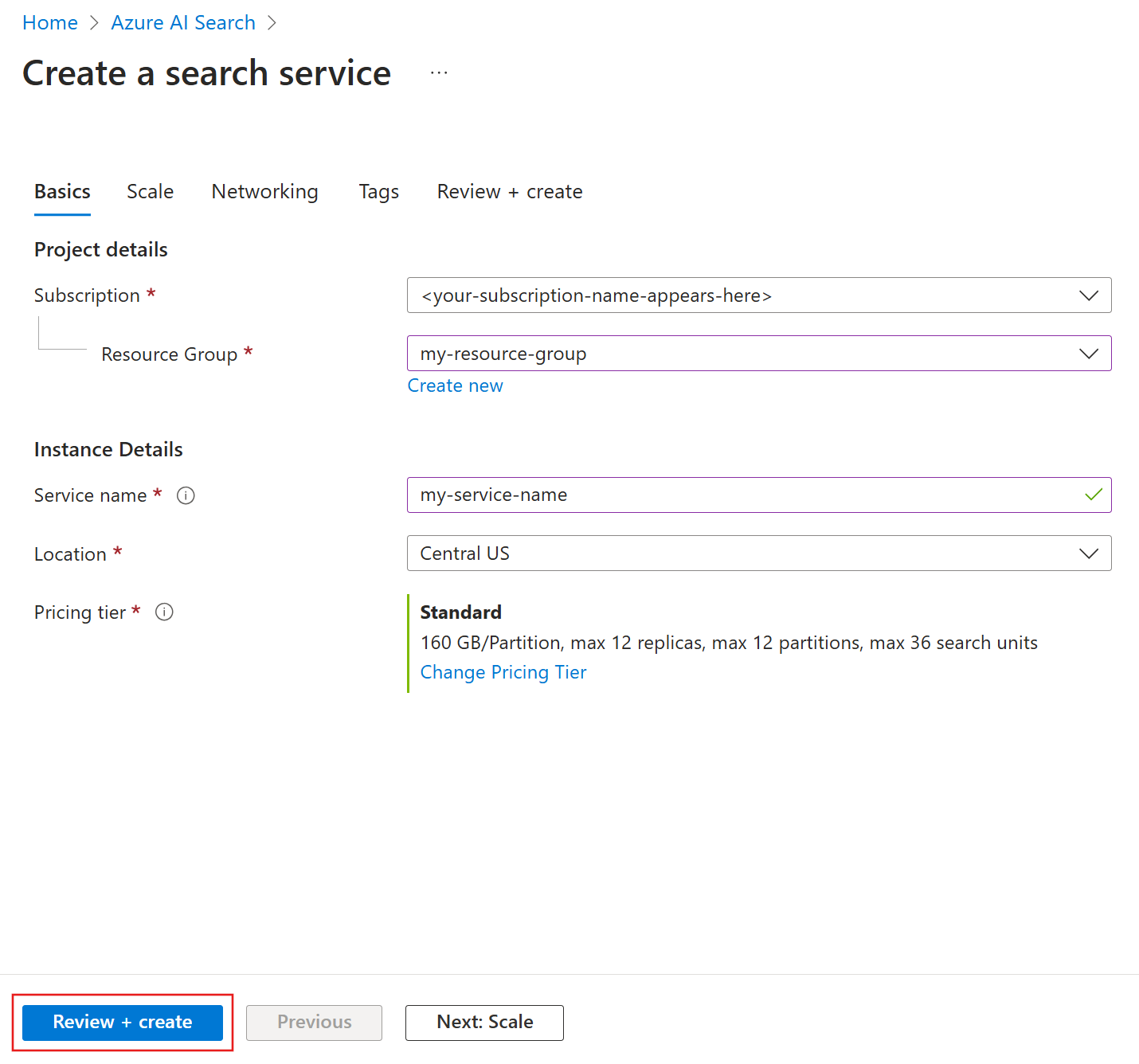 If you have multiple search services, it's helpful to include the region in the service name. For example, when deciding how to combine or attach resources, the name myservice-westus might save you a trip to the Properties page.