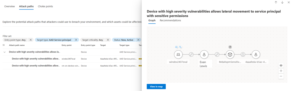 Select the attack path titled: "Device with high severity vulnerabilities allows lateral movement to service principal with sensitive permissions"