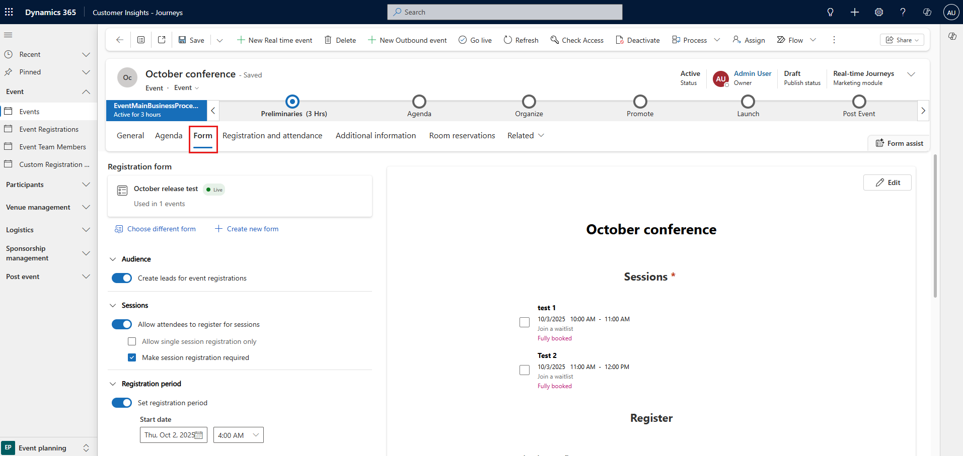 - Sessions calendar: Shows a calendar of sessions defined for your event. You can create and edit sessions using the calendar. More information: Work with marketing calendars.