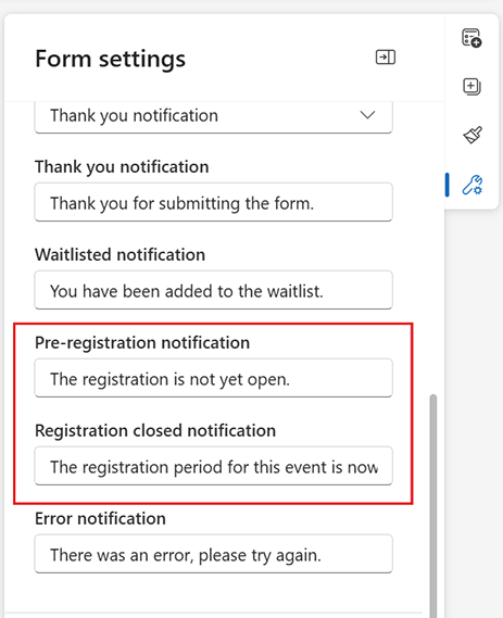 Registration period: Allows you to define when the registration period is opened. You can define the registration start and end date. The dates are in the event timezone. In the form, you can customize the message that's shown to attendees before and after the registration period. To edit the message, navigate to the form settings and under submission, define the preregistration notification and registration closed notification.