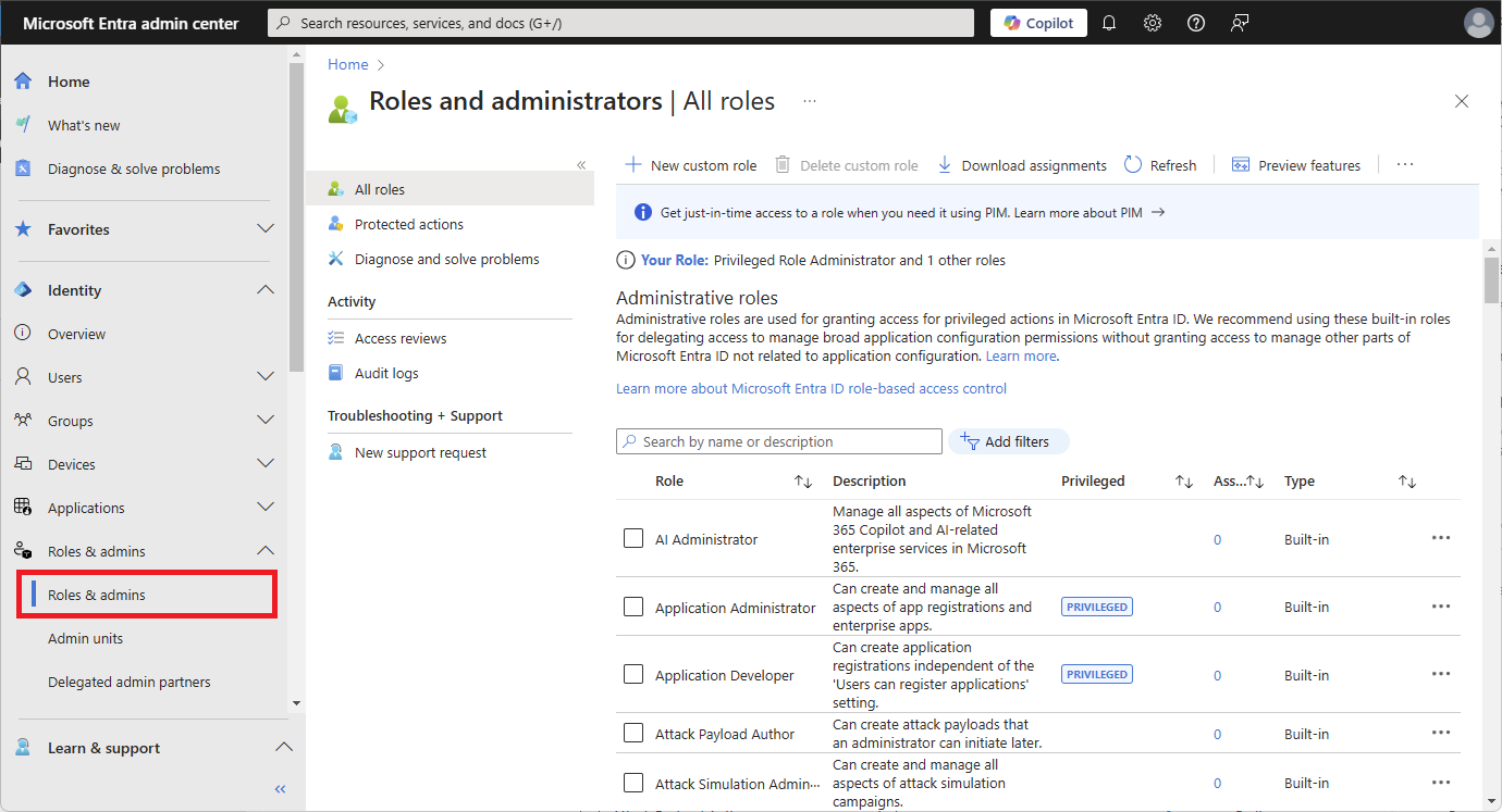 Browse to Entra ID > Roles & admins.