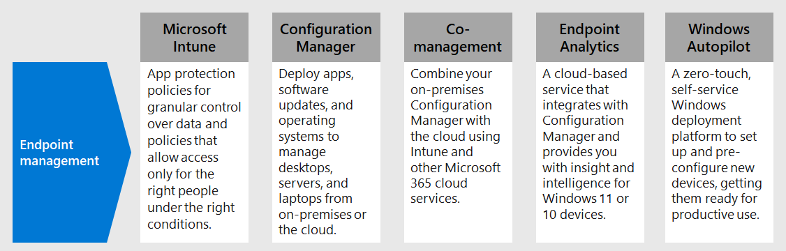 With hybrid workers, you need to support a growing number of personal devices. Endpoint management is a policy-based approach to security that requires devices to comply with specific criteria before they are granted access to resources. The Microsoft Intune family of products delivers modern management capabilities to keep your data secure in the cloud and on-premises.