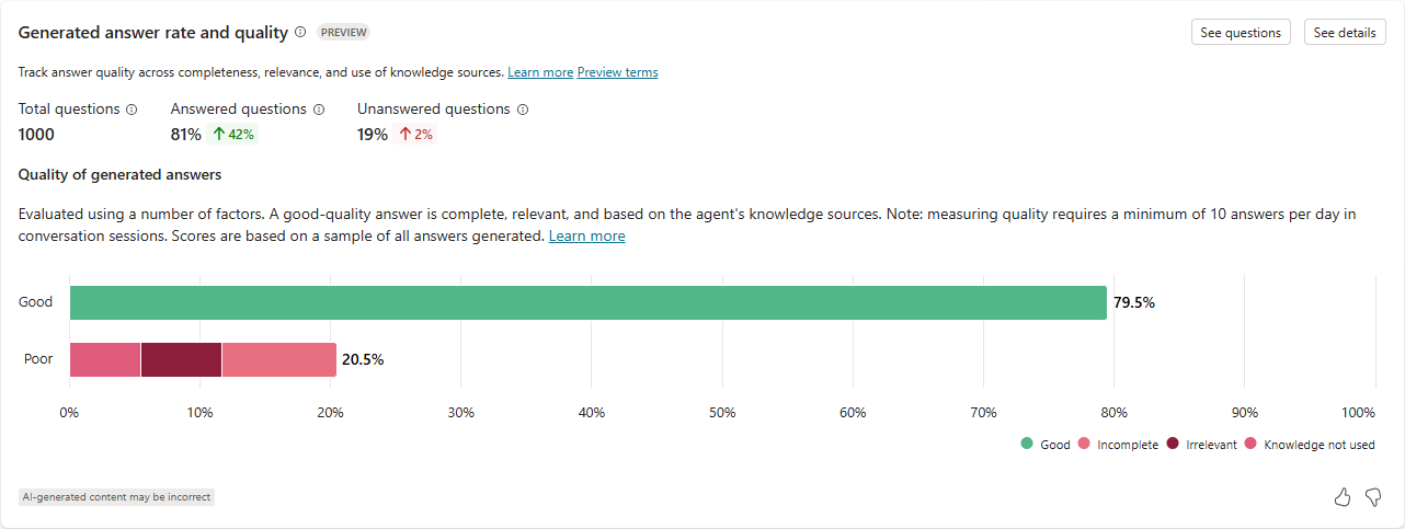 With generative answers, your agent can use AI to generate answers to user queries using knowledge sources and the instructions you provide. However, your agent might not be able to answer all user queries. The Generated answer rate and quality section tracks, organizes, and analyzes unanswered queries and answer quality to give you guidance for improving your agent's answering performance.