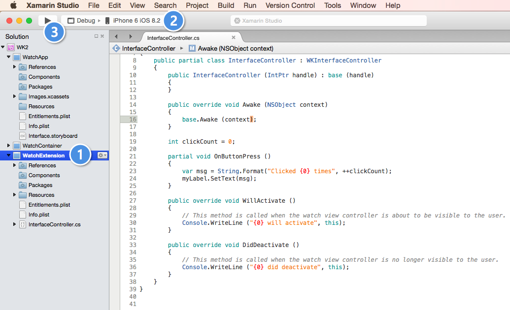 Now open InterfaceController.cs (not InterfaceController.designer.cs) and add the following code: