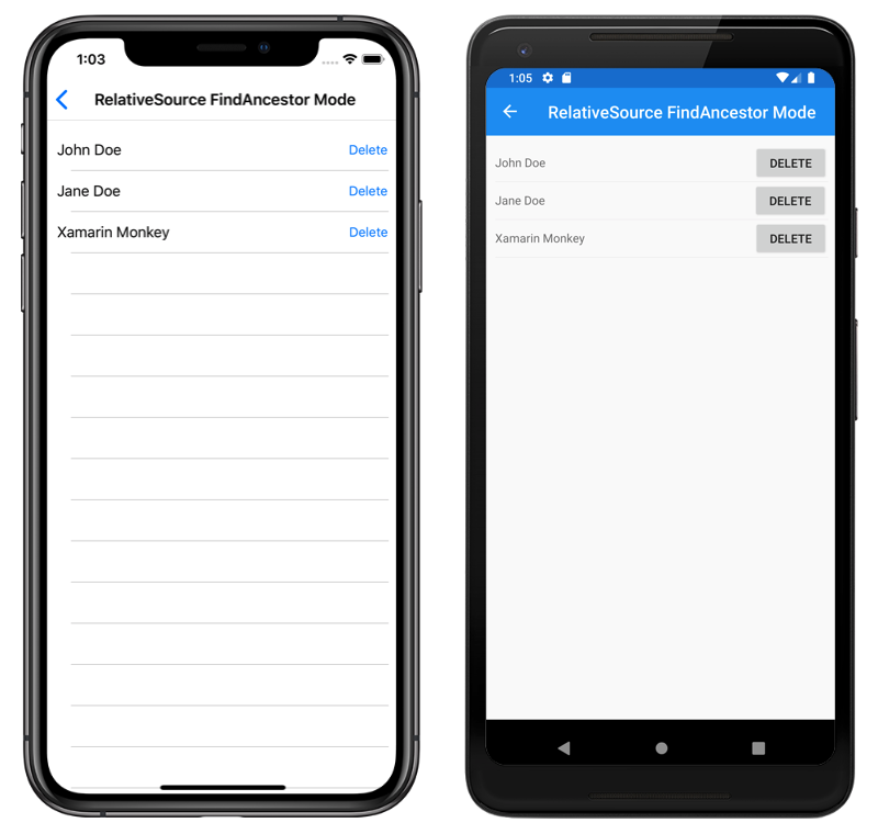 Screenshot of a FindAncestor mode relative binding, on iOS and Android