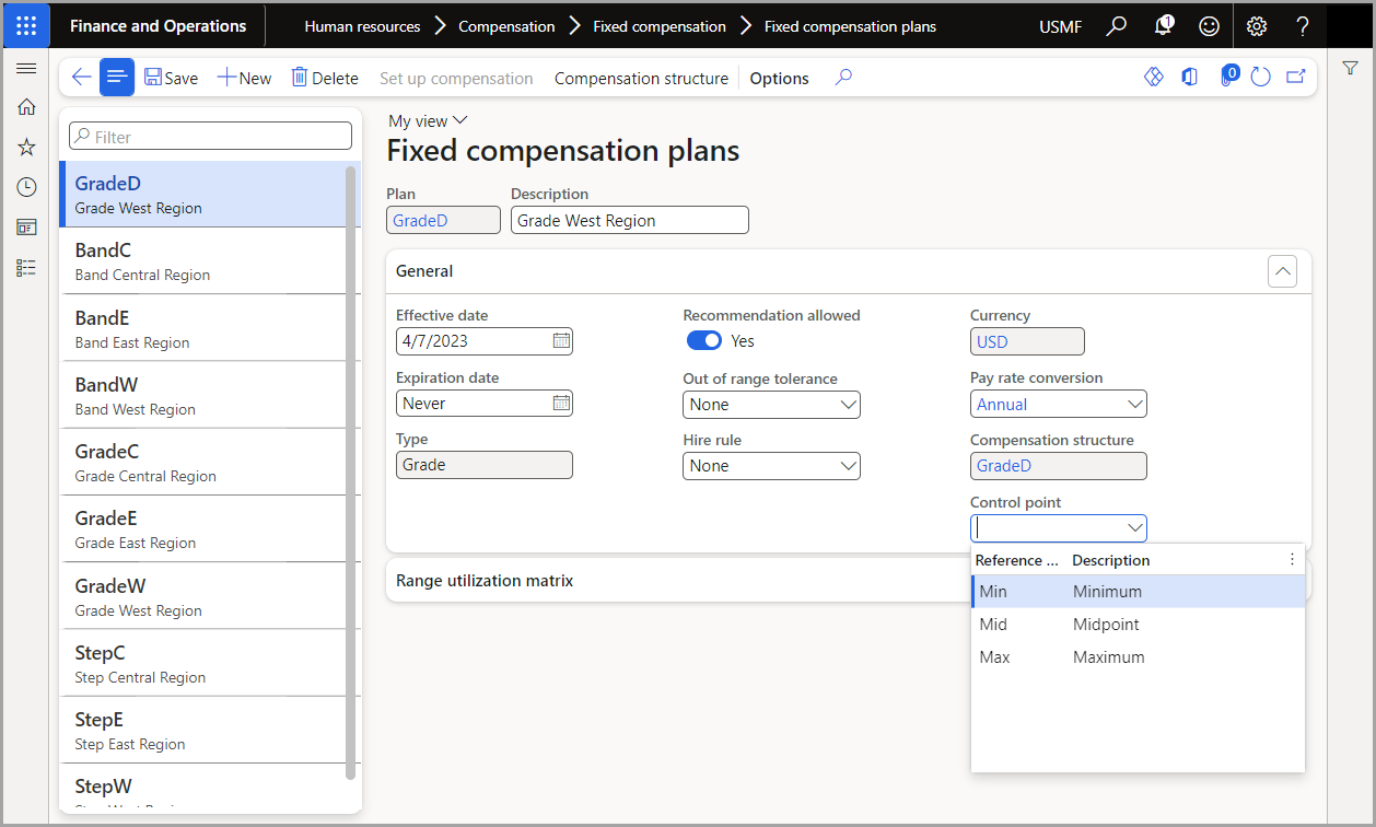 In the Control point field, enter or select a reference point to use as the control point for the fixed compensation plan. The control point is used to calculate an employee's Compensation Ratio.