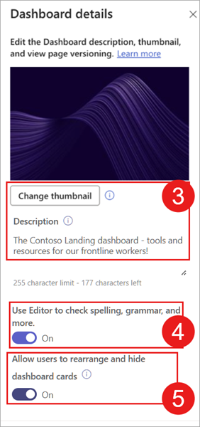 In the Dashboard details pane, you can add a thumbnail and description to show in search results: