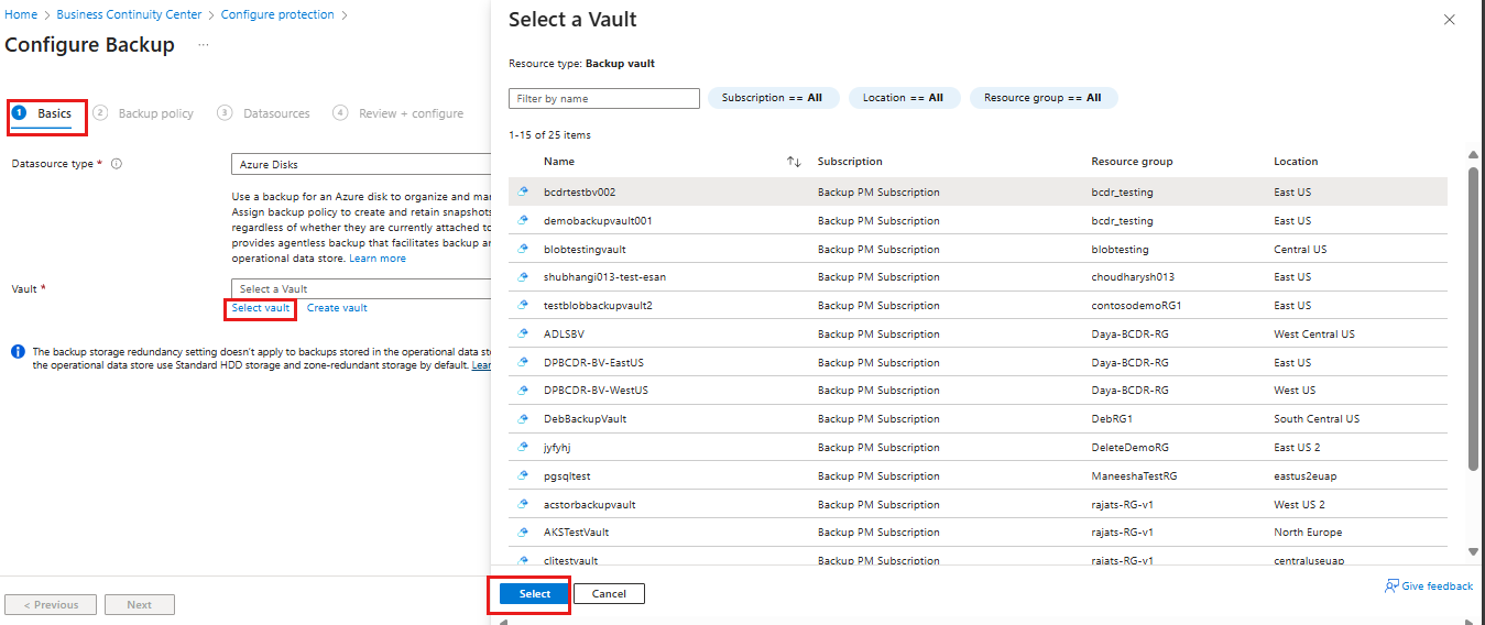 On the Configure Backup pane, on the Basics tab, under Vault, click Select vault.