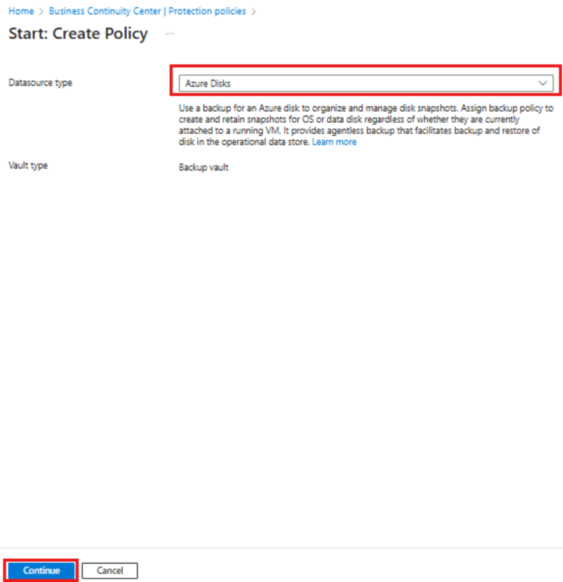 On the Start: Create Policy pane, select the Datasource type as Azure Disks, and then select Continue.