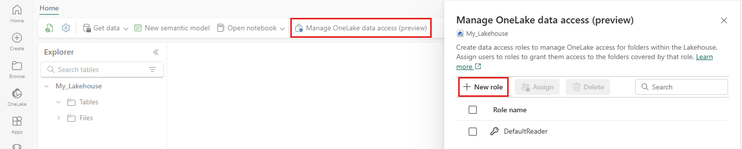 Select Manage OneLake data access (preview) from the ribbon, and confirm that you want to enable data access roles (preview) for the lakehouse.