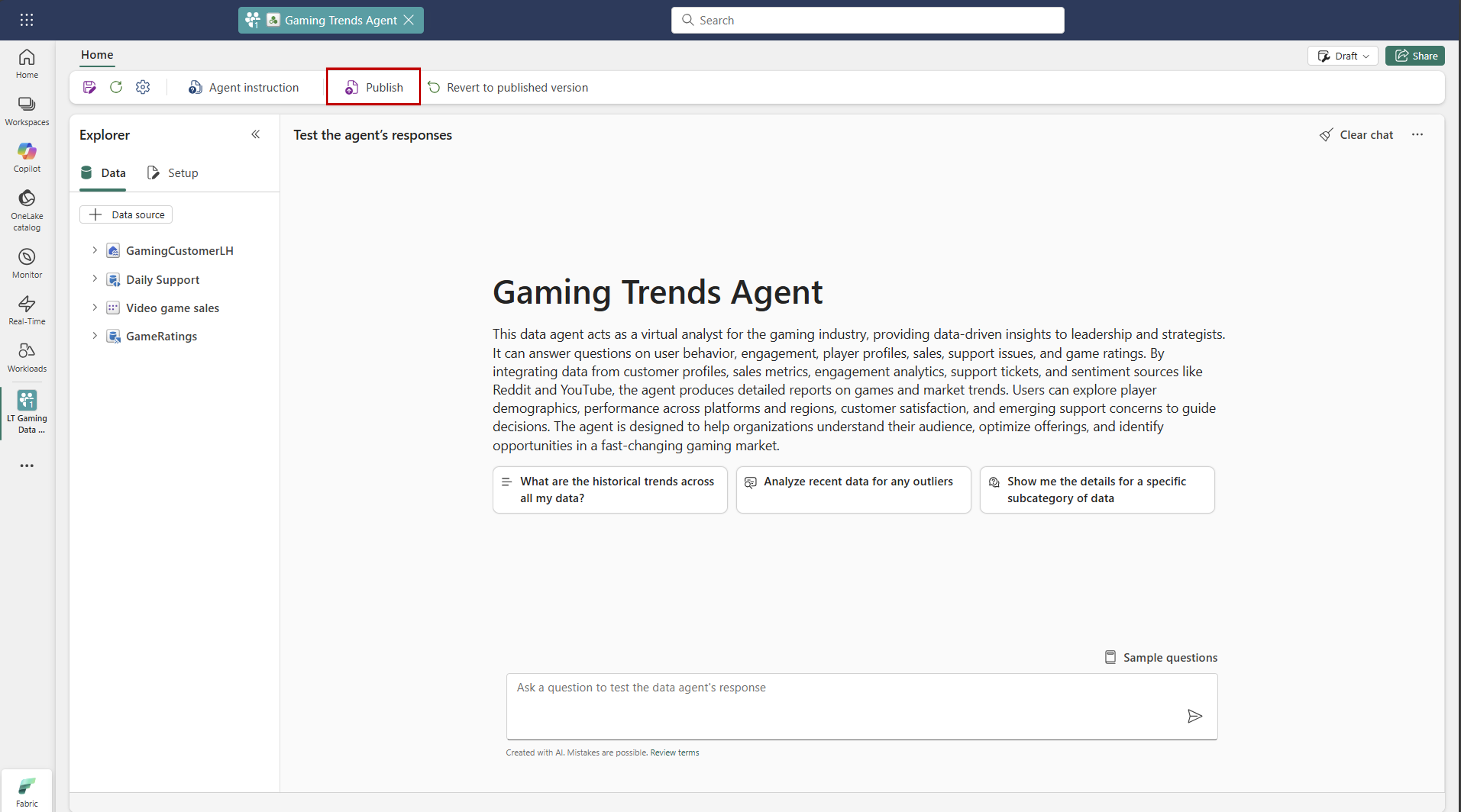 The process is straightforward and you can begin testing the Fabric data agent resources in minutes.