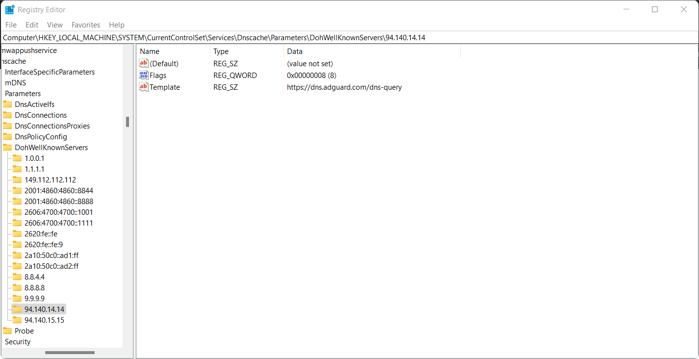 \HKEY_LOCAL_MACHINE\SYSTEM\CurrentControlSet\Services\Dnscache\Parameters\DohWellKnownServers