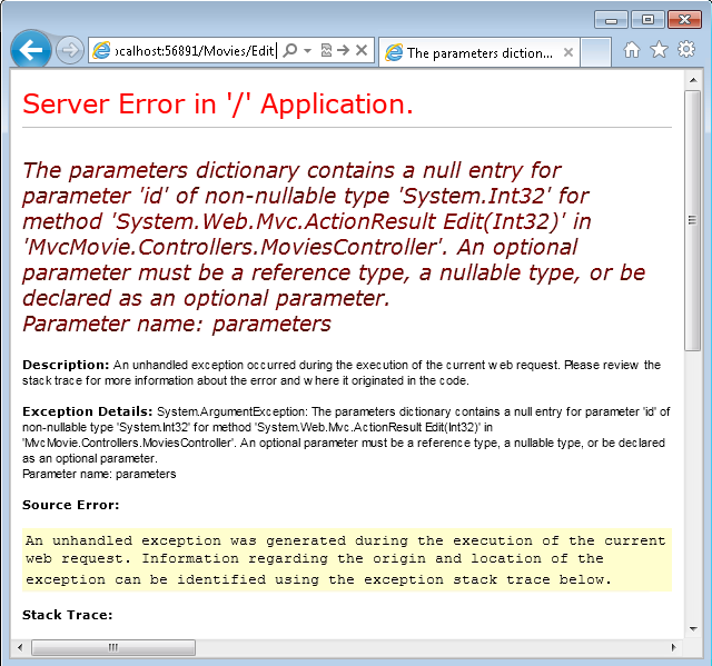 The HttpGet Edit method generated by the scaffolding system doesn't check that the ID that's passed to it is valid. If a user removes the ID segment from the URL (http://localhost:xxxxx/Movies/Edit), the following error is displayed: