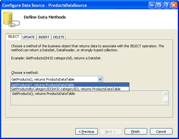 After selecting ProductsCL, click Next. The drop-down list in the SELECT tab has two items - GetProducts() and GetProductsByCategoryID(categoryID) and the UPDATE tab has the sole UpdateProduct overload. Choose the GetProducts() method from the SELECT tab and the UpdateProducts method from the UPDATE tab and click Finish.