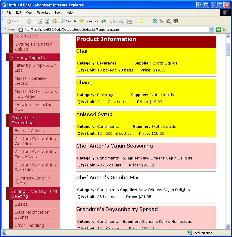 Once you have replicated the DataList and ObjectDataSource functionality from Basics.aspx into Formatting.aspx, take a moment to change the DataList s ID property from DataList1 to a more descriptive ItemDataBoundFormattingExample. Next, view the DataList in a browser. As Figure 1 shows, the only formatting difference between each product is that the background color alternates.
