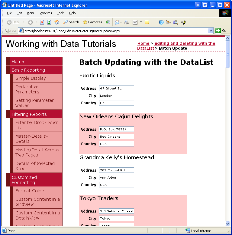 After making these changes, visit this page through a browser. As Figure 5 shows, each DataList item displays the supplier name as text and uses TextBoxes to display the address, city, and country/region.