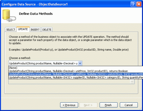 This will create an ObjectDataSource with an UpdateParameters collection with four parameters and a GridView with a field for each of the product fields. The ObjectDataSource's declarative markup assigns the OldValuesParameterFormatString property the value original_{0}, which will cause an exception since our BLL class's don't expect an input parameter named original_productID to be passed in. Don't forget to remove this setting altogether from the declarative syntax (or set it to the default value, {0}).