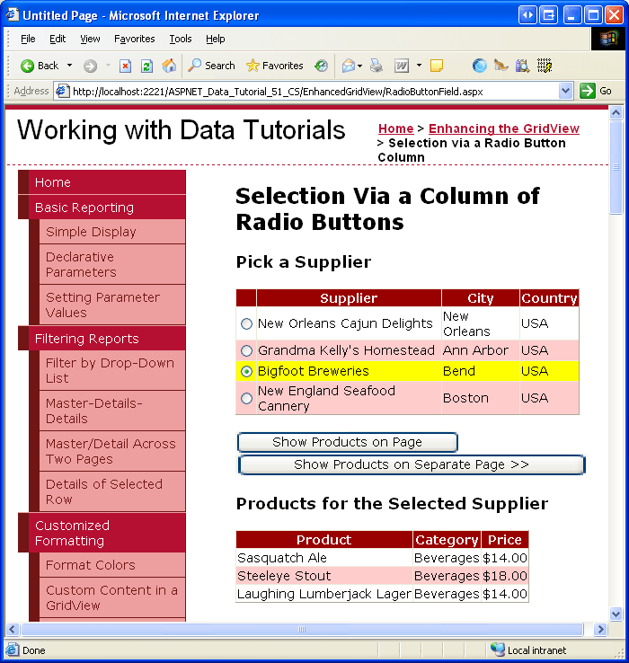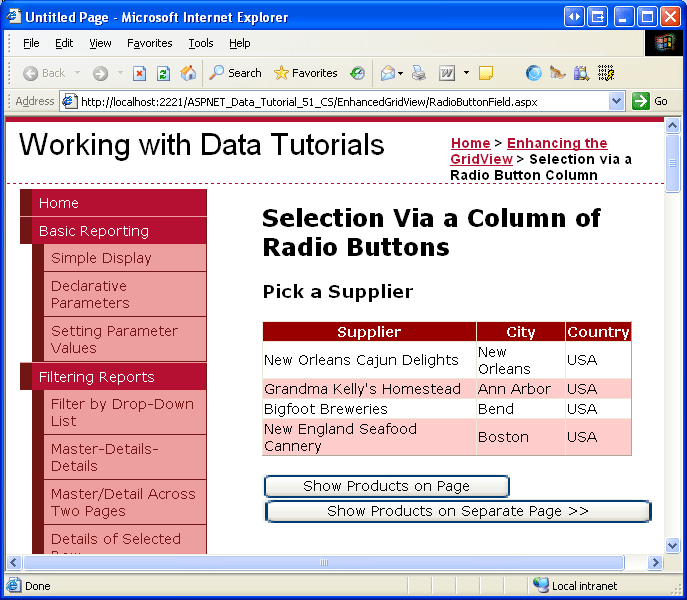 After the user has selected a GridView row, we need to show the selected supplier s products. In some circumstances, we may want to display these products in a separate page, in others we might prefer to do it in the same page. Let s first examine how to display the products in a separate page; in Step 5 we'll look at adding a GridView to RadioButtonField.aspx to display the selected supplier s products.