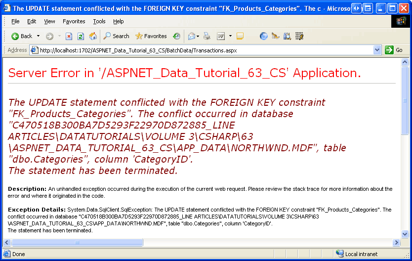 Now try clicking the Modify Categories (WITHOUT TRANSACTION) button. This will result in the same foreign key constraint violation error (see Figure 9), but this time those products whose CategoryID values were changed to a legal value will not be rolled back. Hit your browser s Back button and then the Refresh Grid button. As Figure 10 shows, the CategoryID s of the first eight products have been reassigned. For example, in Figure 8, Chang had a CategoryID of 1, but in Figure 10 it s been reassigned to 2.