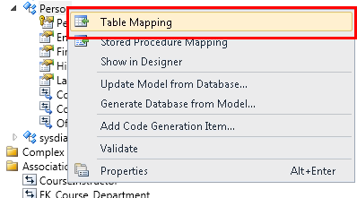 In either the designer or the Model Browser pane you can see how the Entity Framework relates the objects of the two models. Right-click the Person entity and select Table Mapping.
