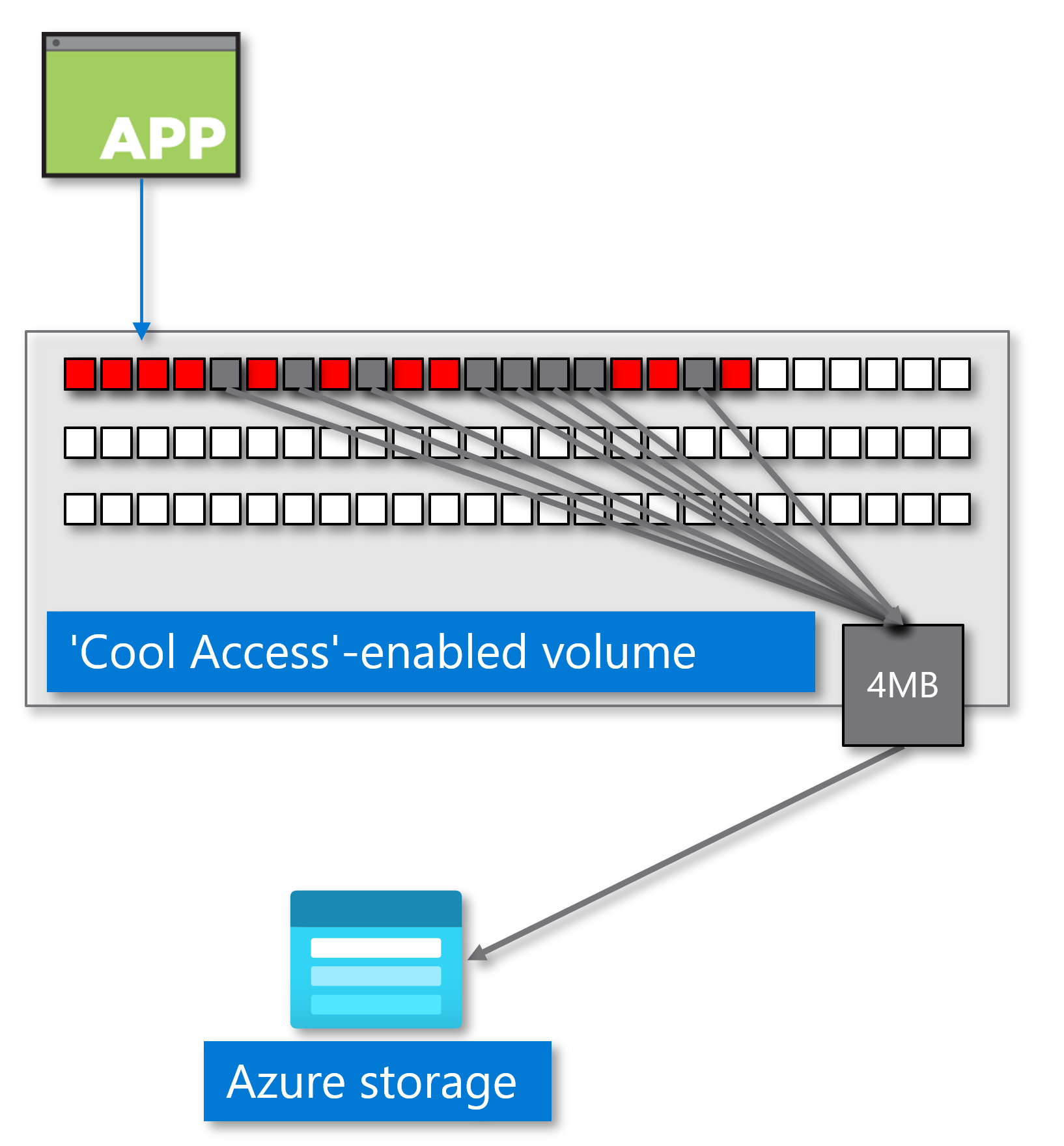 After data blocks are marked "cold," the tiering scan collects the blocks and packages them into 4-MB objects. Their move to Azure storage is transparent. To the application and users, the cool blocks still appear online. Tiered data appears to be online and continues to be available to users and applications by transparent and automated retrieval from the cool tier.