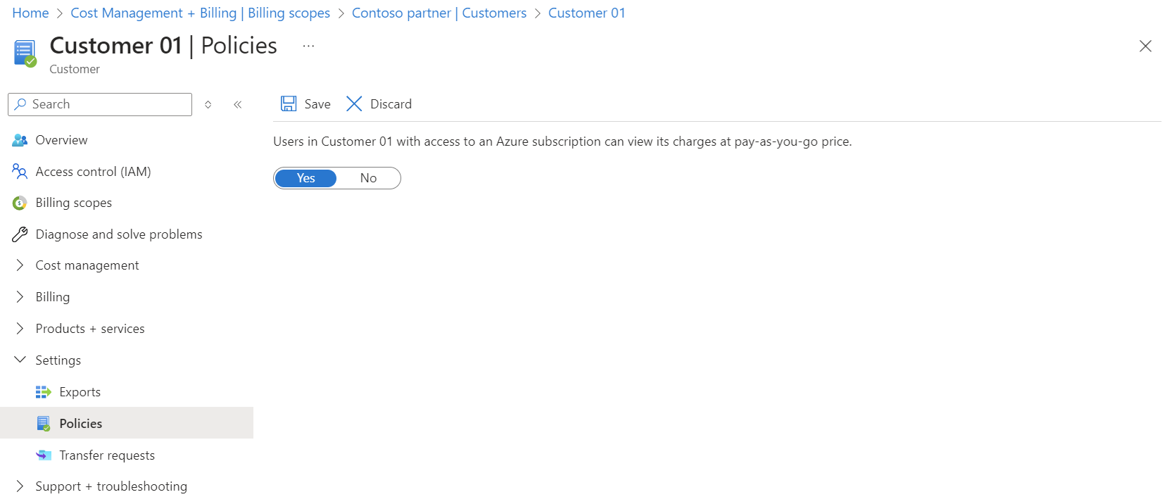 Apply policy to control whether users in a customer's organization can view and analyze cost at pay-as-you-go rates for their Azure consumption. By default, the policy is turned off and users can't view the cost. Once enabled, the users who have appropriate Azure RBAC access on a subscription can view and analyze the cost for the subscription.
