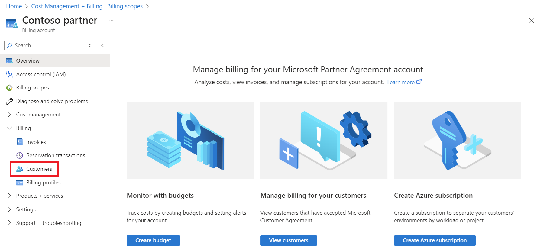 You can view and manage customers that accepted a Microsoft Customer Agreement and have an Azure Plan in the Azure portal. You can view charges and transactions as well as create and manage Azure subscriptions for these customers.