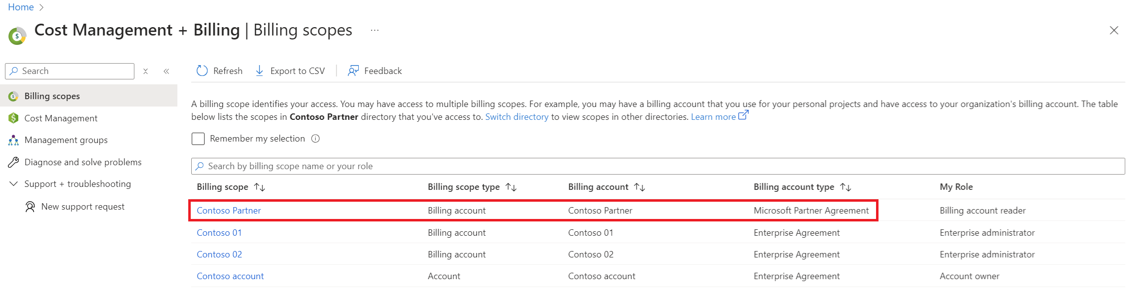 If you have access to multiple billing scopes, check the type in the billing account column. You have access to a billing account for a Microsoft Partner Agreement if the billing account type for any of the scopes is Microsoft Partner Agreement.