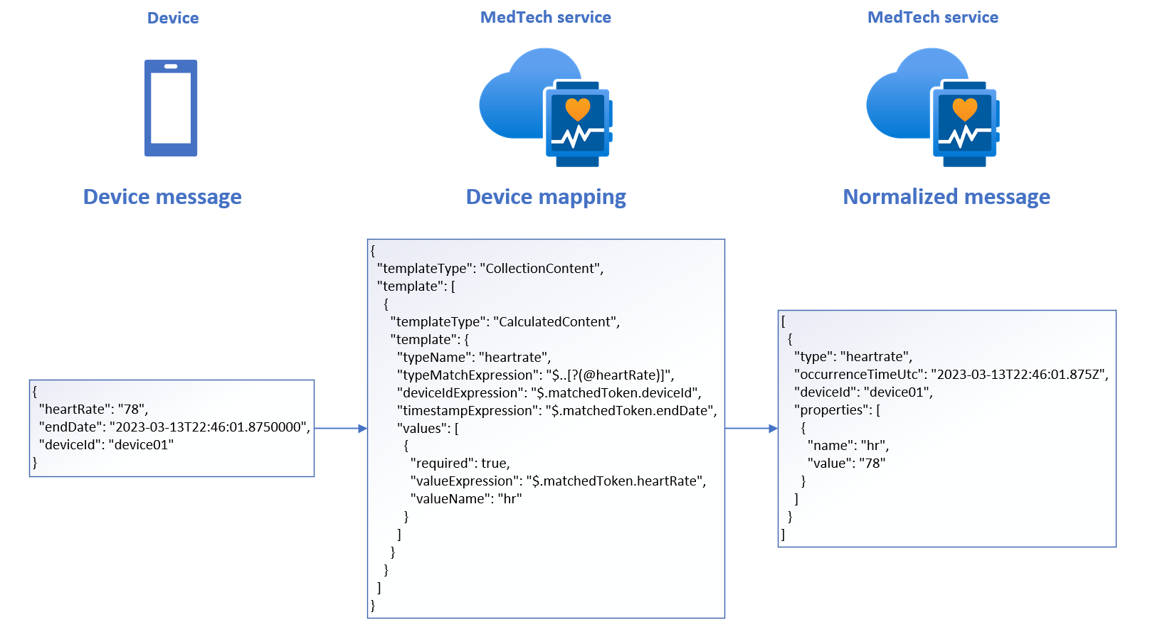 The MedTech service requires two types of JSON mappings that are added to your MedTech service through the Azure portal or Azure Resource Manager (ARM) API. The device mapping is the first type and controls mapping values in the device data sent to the MedTech service to an internal, normalized data object. The device mapping contains expressions that the MedTech service uses to extract types, device identifiers, measurement date time, and measurement value(s). The FHIR® destination mapping is the second type and controls the mapping for FHIR Observations.