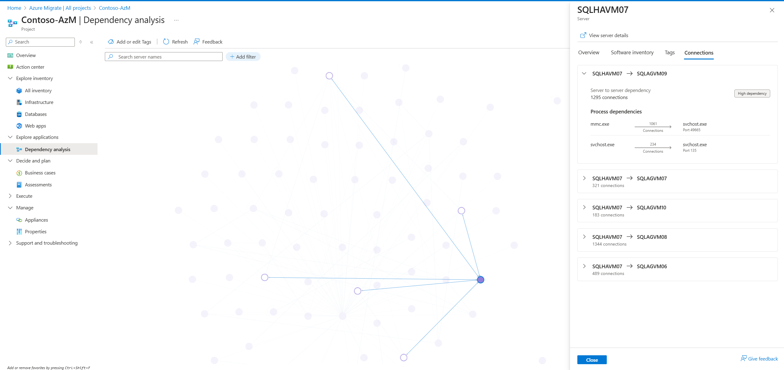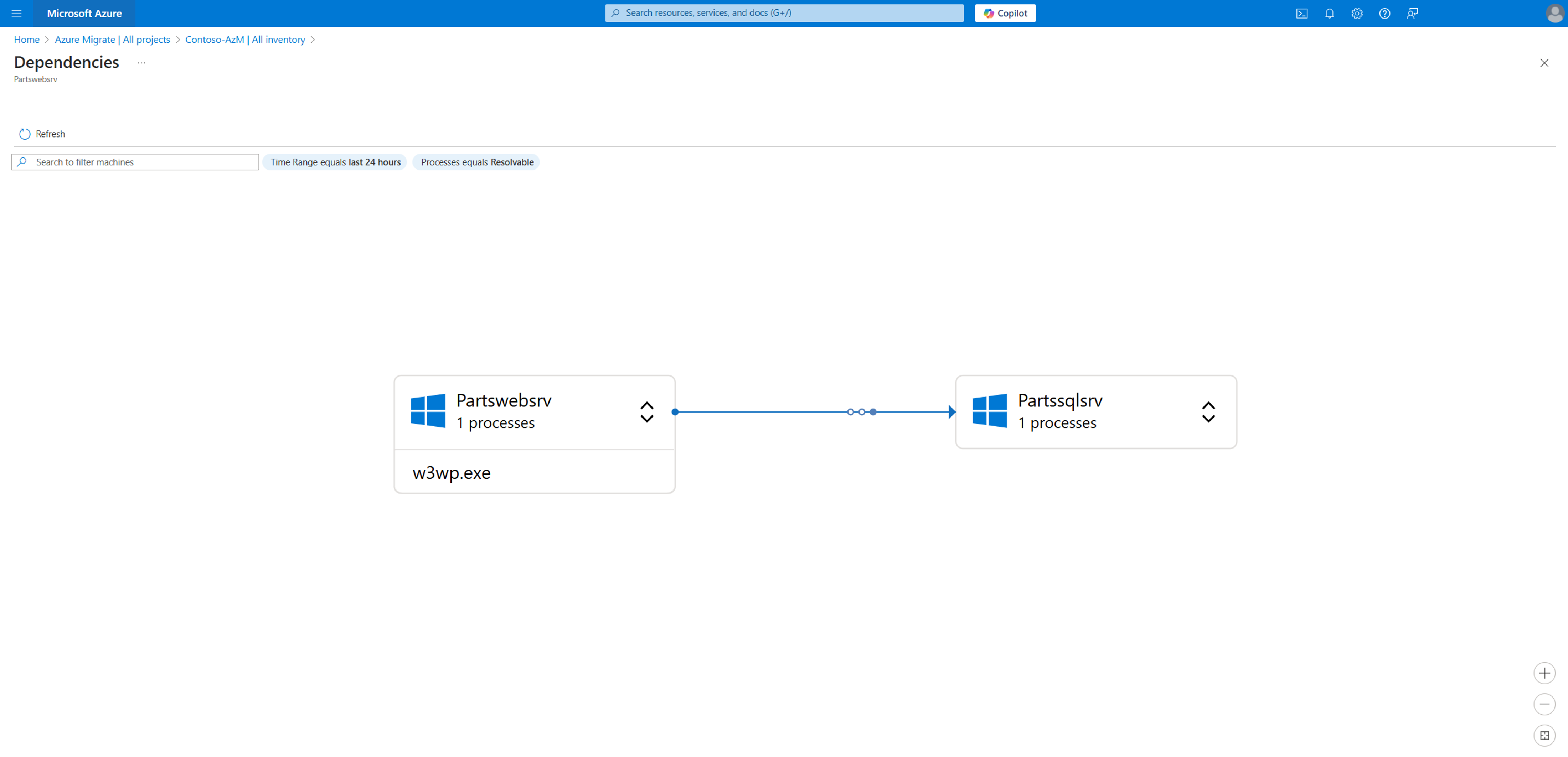 After initiating discovery from the appliance, you can come to Migrate project on the Azure portal and review the dependency data. We recommend that you wait for at least 24 hours to allow for enough dependency data to be gathered for your servers and show in a visualization.