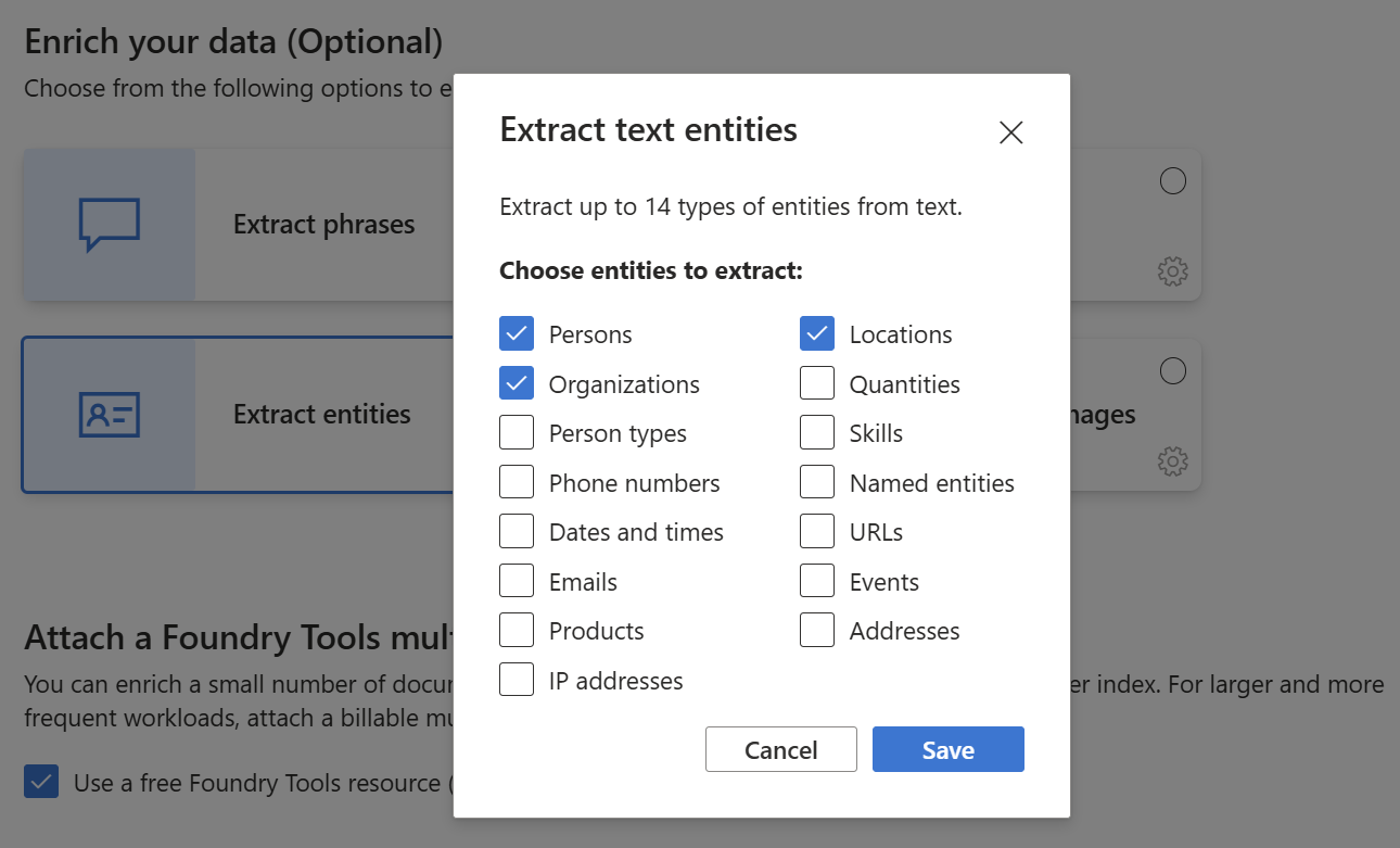 This quickstart uses Foundry Tools for AI enrichment. Because the workload is small, Foundry Tools is tapped behind the scenes for free processing up to 20 transactions. Therefore, you don't need to create a Microsoft Foundry resource.